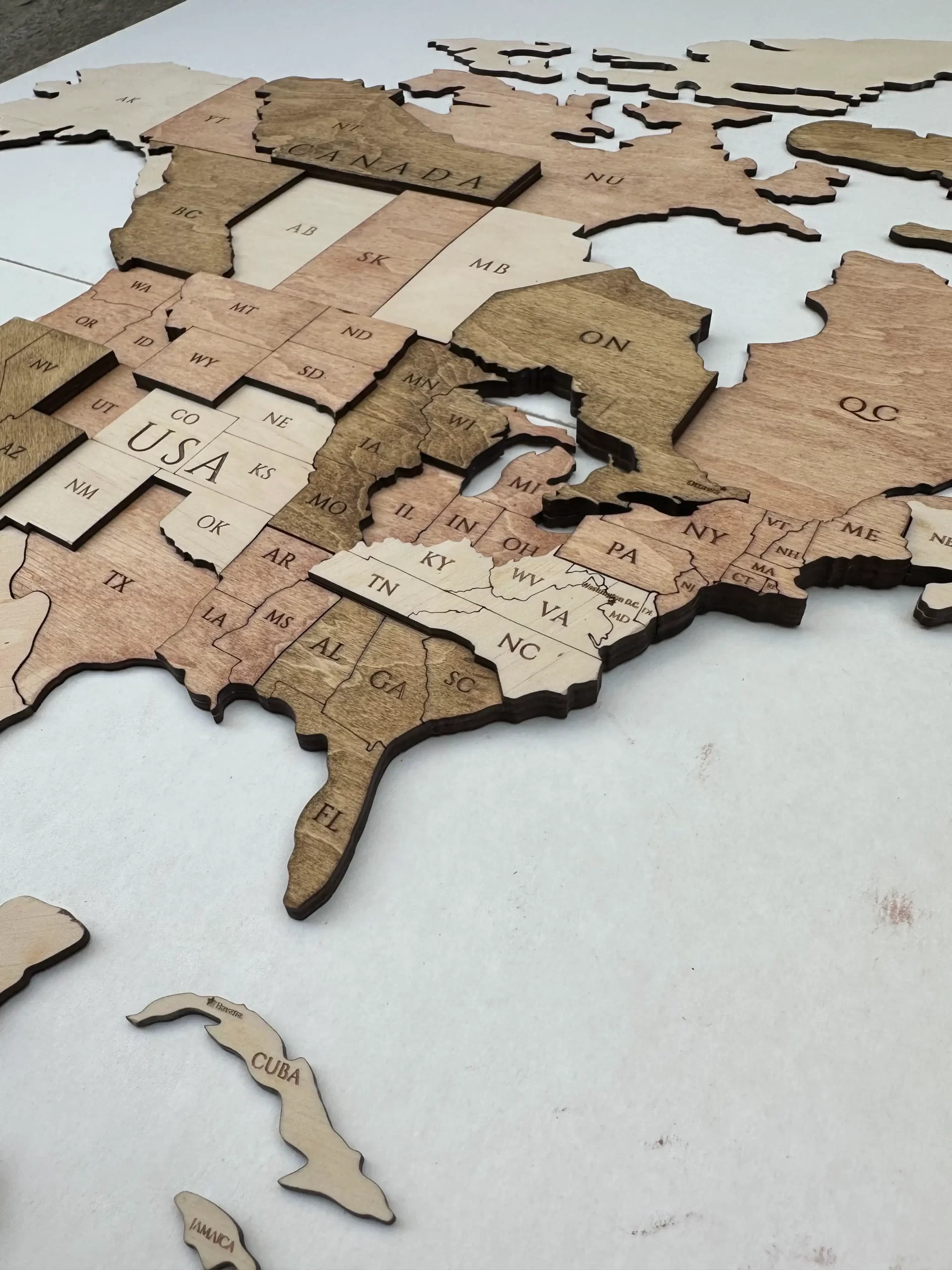 Ο χάρτης μεγέθους M (100×60 cm) δείχνει μόνο ονόματα χωρών, χωρίς κεφαλαία. Όλα τα άλλα μεγέθη έχουν χαραγμένα ονόματα χωρών και κεφαλαία. Χαρακτηριστικά: Ο χάρτης είναι κατασκευασμένος από υψηλής ποιότητας υλικό σημύδας και επεξεργάζεται με χρωματιστά λάδια ξύλου. Πάχος: 3mm – 9mm Το σετ περιλαμβάνει: